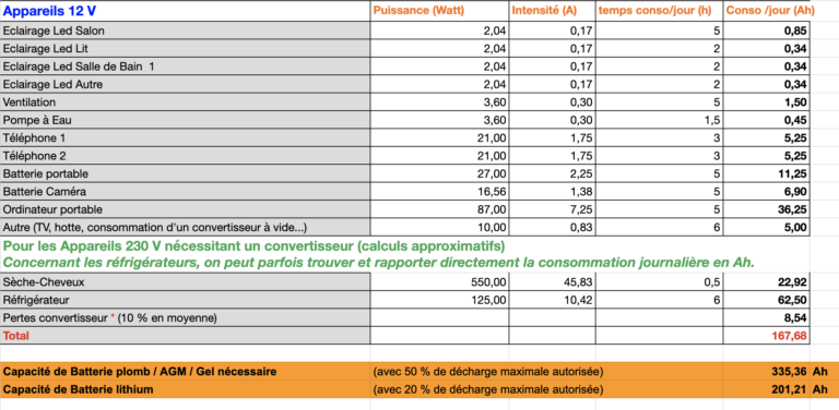 Dans un tableau, listez tous vos appareils électriques et ceux que vous rechargez sur 12 Volt (éclairage, réfrigérateur à compression, téléviseur, four, climatiseur, pompes à eau, boiler, antenne TV, etc.) avec leur intensité (Ampère). Ces mentions figurent généralement au dos des appareils.