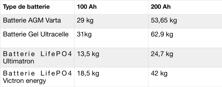 À capacité équivalente, le poids d’une batterie  lithium LiFePO4 est plus léger que celui des batteries de technologie plomb ou gel. Elles occupent aussi souvent un moindre volume.