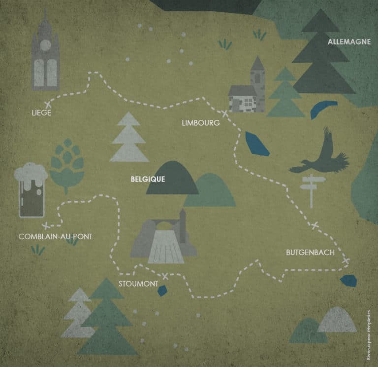 Nous apprenons que ce bourg de caractère est situé à la limite des Cantons de l’Est (Ostbelgium) où vit la plus grande partie de la Communauté germanophone, une entité fédérée de Belgique. Par Jupiler ! Mais c’est que nous avions totalement occulté cette donnée ! Aussitôt, Simon réactive son allemand… scolaire, ce qui a le don de faire sourire les personnes que nous rencontrons. L’effort est fait, même si, nous nous apercevons vite que tout le monde, ou presque, comprend le français ici. Il est d’usage de passer d’une langue l’autre en un claquement de doigt. Comme ces paysages changeant, qui nous acheminent sans que l’on le sache encore, vers le lieu le plus incroyable du parcours.