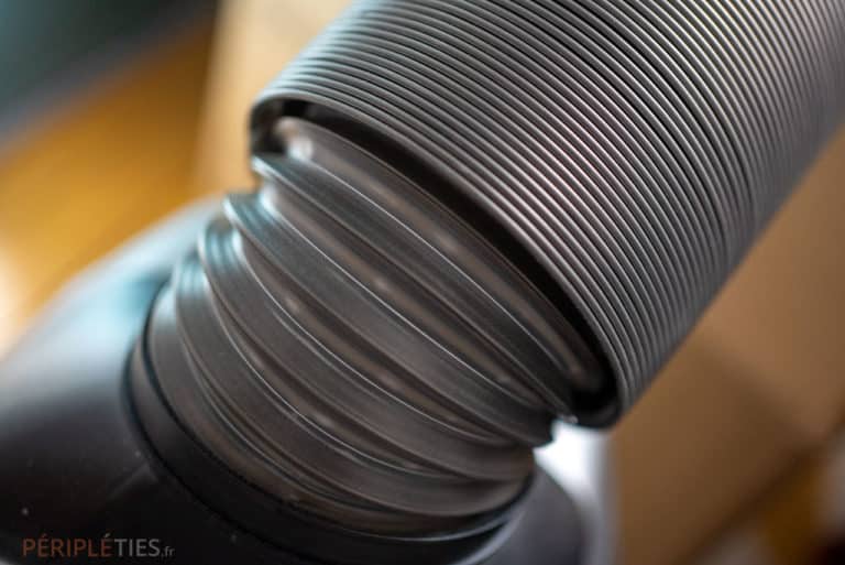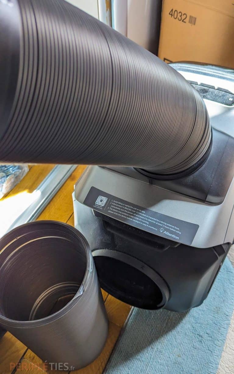 Pour faire sortir l’air chaud (et froid) du climatiseur, le produit est livré avec deux gros conduits d’échappements amovibles (fournis dans le pack), ce qui permet donc de drainer l’air hors de la pièce ou du véhicule.