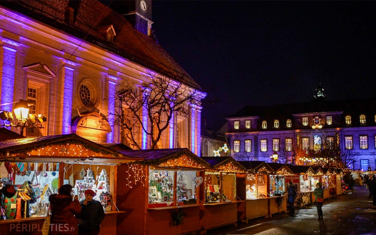 Dans l’ombre des marchés de Noël alsaciens, le marché de Noël de Montbéliard est pourtant l’un des plus beaux de l’Est, grâce à ses illuminations (qui viennent des Pouilles en Italie) et ses chalets de Noël entourant le temple Saint-Martin.
