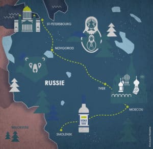 La carte de notre itinéraire russe : de Moscou à Saint-Pétersbourg