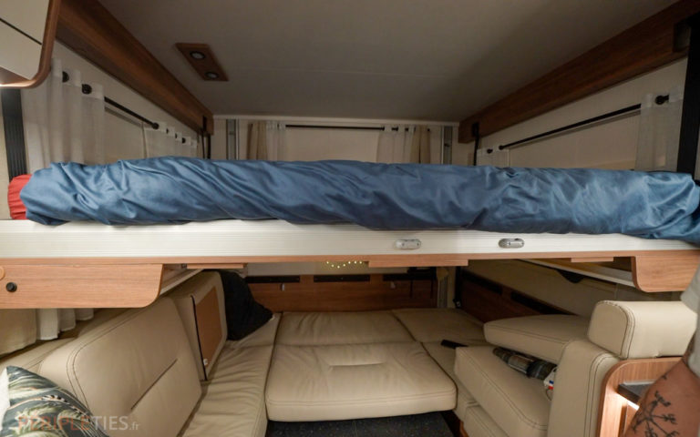 Pour garder un modèle compact, Pilote a fait le choix sur ce modèle P 696 U d’un grand lit pavillon électrique (160 x 200 cm) au dessus du salon que l’on abaisse facilement via le panneau de contrôle.