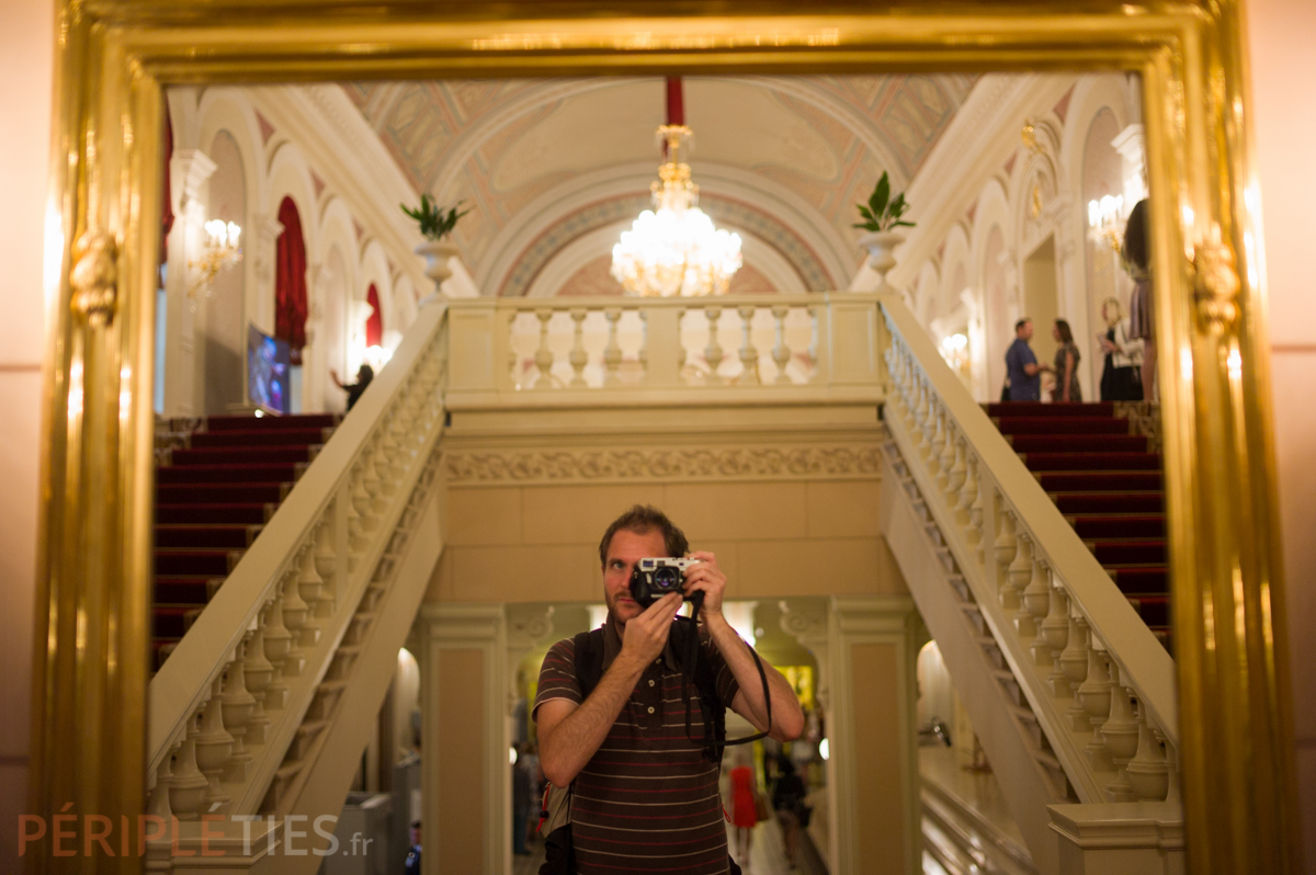 Le théâtre Bolchoï (le Grand Théâtre en français) fait partie de ce patrimoine dont la simple évocation transpire un prestige acquis au fil des années dans le paysage culturel de Moscou ! L’extérieur de style néoclassique tranche avec son intérieur, un dédale de dorures et de velours rouge. L’une des pièces est un musée qui retrace l’histoire de la troupe du Bolchoï, avec les costumes de ses représentations. Opéras et ballets de haute-qualité se produisent encore plusieurs fois par semaine. Et quelle sensation d’assister à une représentation ! Se dire qu’en 1877, se jouait la première du Lac des cygnes du grand maître Tchaikovsky… Oui, on a eu cette chance ! Il faut normalement prévoir à l’avance, alors nous avons laissé faire le destin et obtenu, au hasard d’une balade, des places au marché noir . (Han, pas bien !) Mais on savait qu’on ne reviendrait pas à Moscou de sitôt !