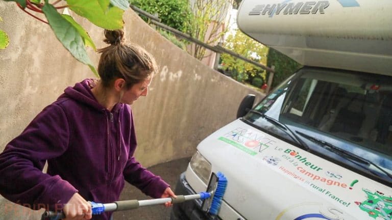 Nous faisons le nettoyage de la carrosserie avec un balais-brosse télescopique et du savon noir.
